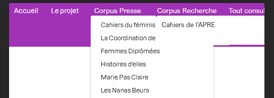 - Question de l'architecture de l'info du site femenrev pour l'intégration d'un onglet éditorial "Recherche" des Cahiers de l'APRE qui ne rentrent pas dans la "Presse". La solution envisagée par Magali Guaresi était de remplacer l'onglet "Description du corpus" par : "Corpus Presse" + "Corpus Actes"// ou // "Corpus Presse" + "Corpus Recherche" cf. image (pas contractuelle).