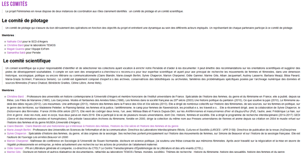 Certains blocs ont été déplacés : j’ai fait remonter le « Comités », qui comprend le fameux comité de pilotage : il était caché tout en bas de la page (après le prestataire de numérisation) et j’ai ajouté des liens vers les CV pour chaque membre. J’ai remplacé le nom de Sebastien, même s’il apparait encore avec Agnieska et Hélène dans la partie « Partenaire de documentation et de diffusion » (que j’ai renommé « Persée, le partenaire de documentation et de diffusion ».