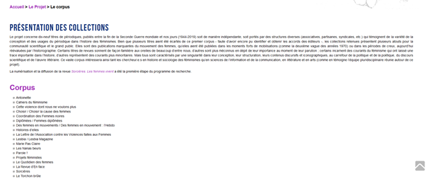 Sur la page suivante je fais une proposition d’affichage différent de cette page « Le Corpus » (ancienne « Les Collections »), qui comprendrait également le texte supprimé dans Le projet > Présentation des collections :