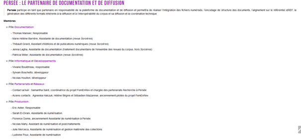 Certains blocs ont été déplacés : j’ai fait remonter le « Comités », qui comprend le fameux comité de pilotage : il était caché tout en bas de la page (après le prestataire de numérisation) et j’ai ajouté des liens vers les CV pour chaque membre. J’ai remplacé le nom de Sebastien, même s’il apparait encore avec Agnieska et Hélène dans la partie « Partenaire de documentation et de diffusion » (que j’ai renommé « Persée, le partenaire de documentation et de diffusion ».